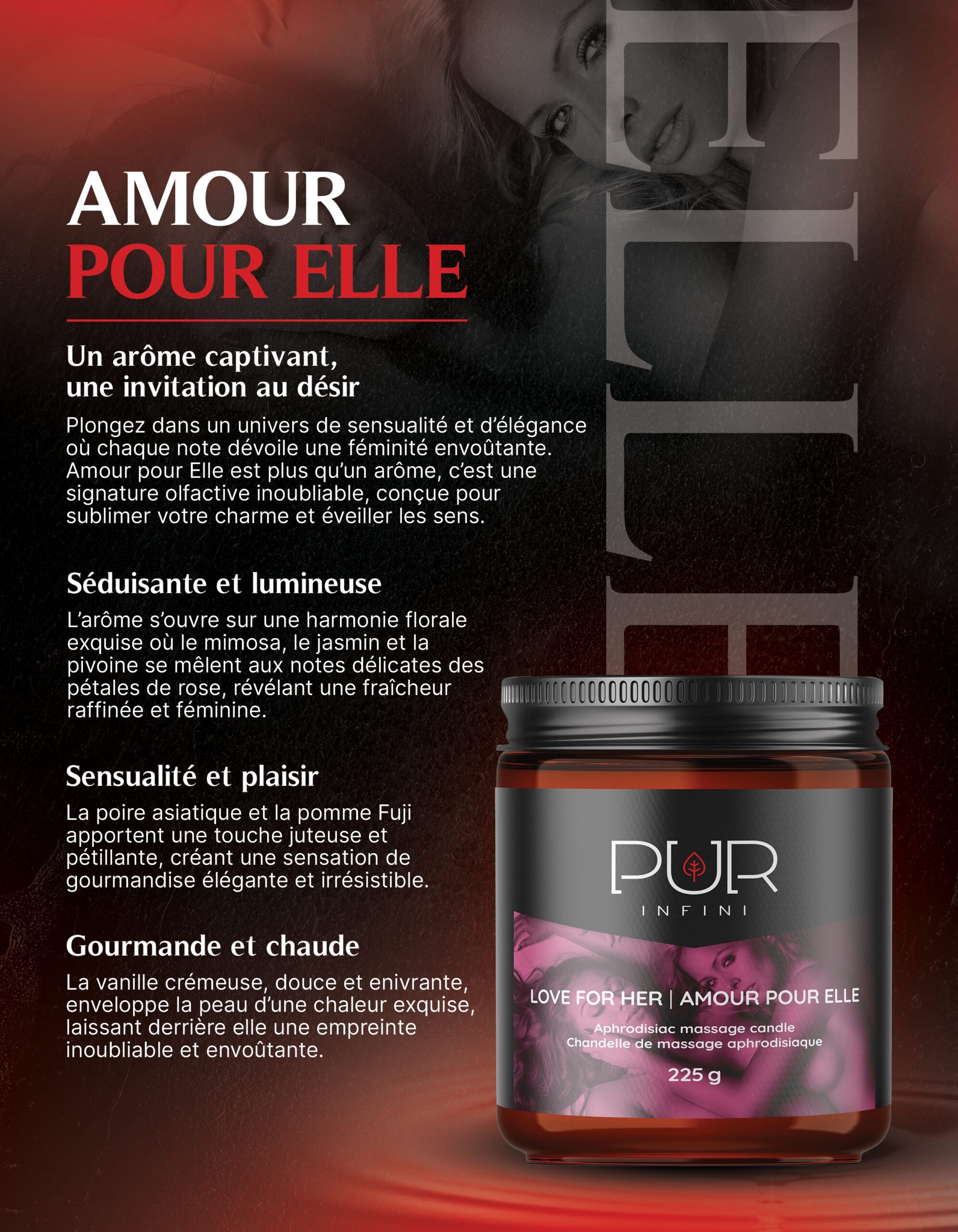 Dès qu’elle fond, la cire de la chandelle Amour Pour Elle se transforme en une huile chaude et soyeuse. Appliquée sur la peau, elle réchauffe, adoucit et intensifie chaque sensation. Son arôme aphrodisiaque, activé par la chaleur corporelle, amplifie l’attraction et prolonge l’instant de complicité et d’amour.