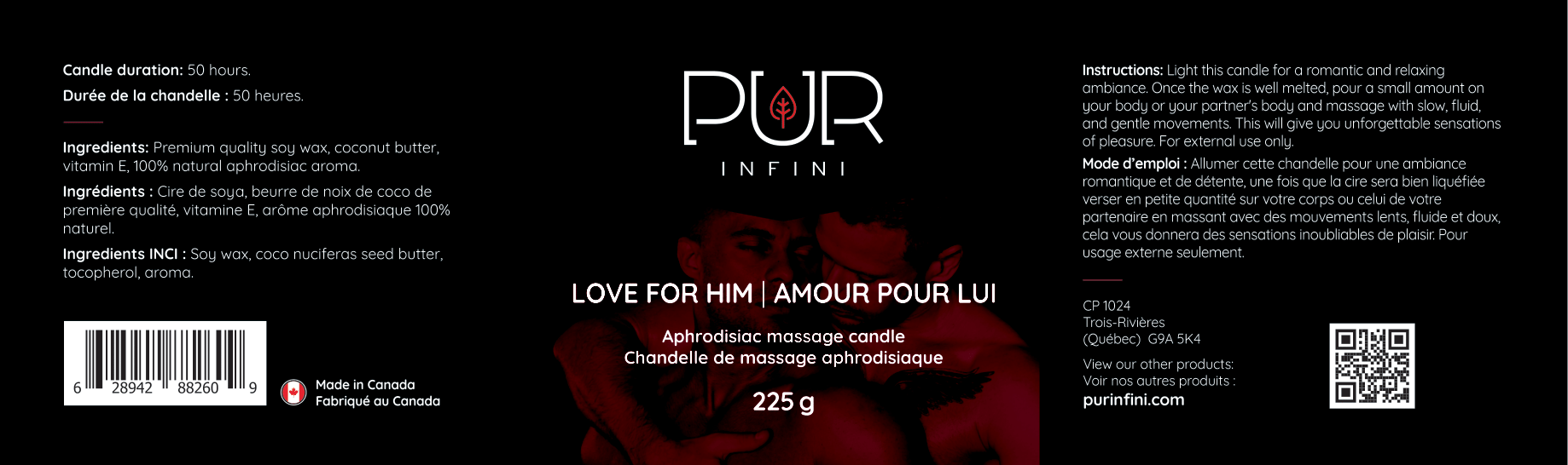 Amour Pour Lui allie élégance et sensualité dans une chandelle de massage aphrodisiaque unique. Sa cire fondante devient une huile chaude et soyeuse, diffusant un parfum masculin et envoûtant qui nourrit la peau et éveille le désir.