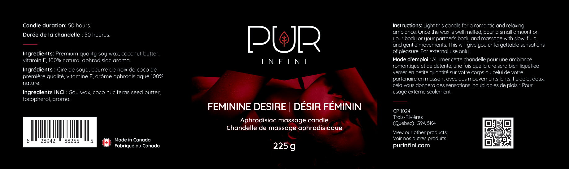 Succombez à Désir Féminin, une création olfactive audacieuse et magnétique, conçue pour révéler la puissance de la sensualité féminine. À la fois exquise et irrésistible, cette chandelle de massage aphrodisiaque incarne la femme moderne : libre, confiante et captivante, laissant derrière elle un sillage de passion et de mystère.