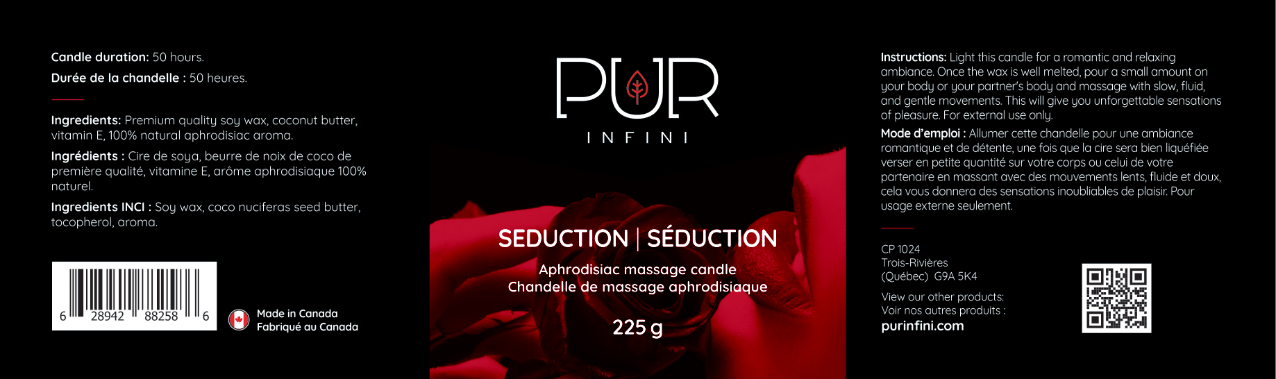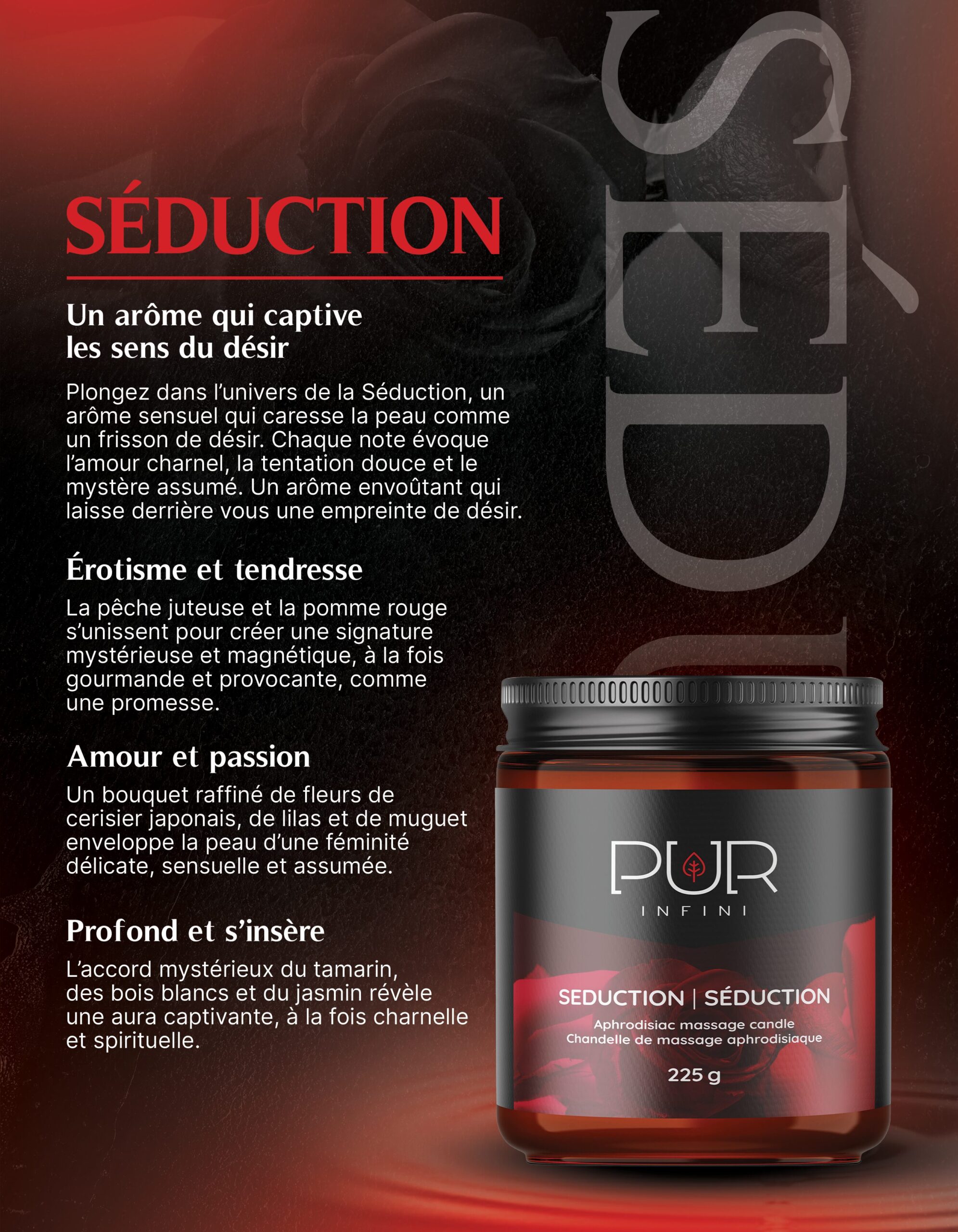 Plongez dans l’univers de Séduction, une chandelle de massage aphrodisiaque qui incarne la passion, l’élégance et le mystère. Chaque note olfactive caresse la peau comme un frisson de désir, éveillant les sens et invitant à la complicité. Véritable hommage à l’amour charnel et à la féminité assumée, Séduction laisse derrière elle une empreinte sensuelle, raffinée et inoubliable.