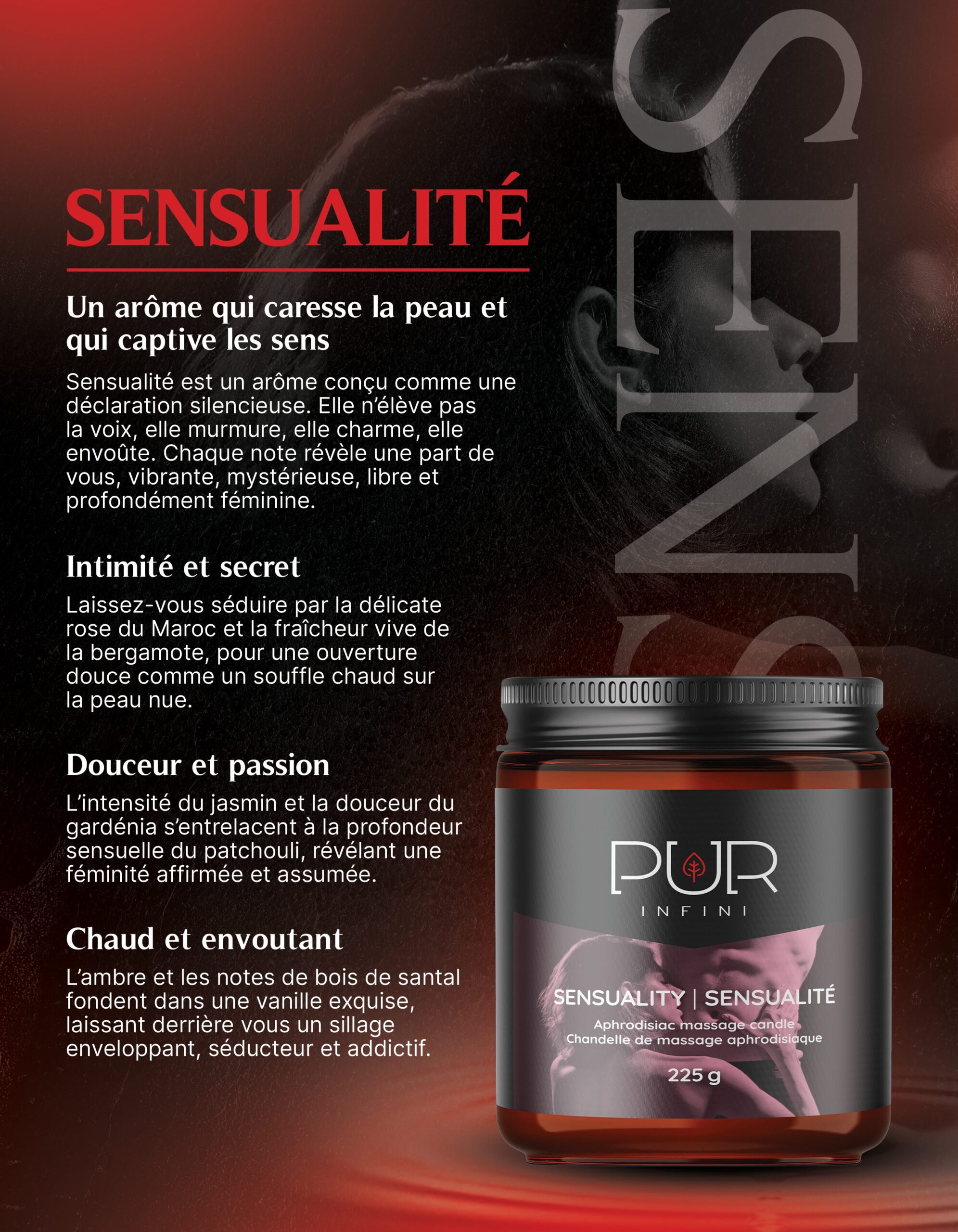 Son arôme aphrodisiaque s’active au contact de la chaleur corporelle, créant une atmosphère d’intimité, de détente et de désir partagé.